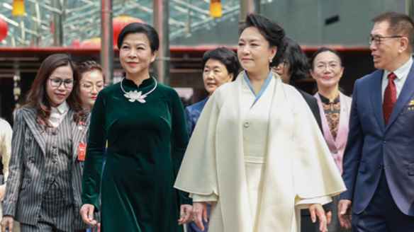 ທ່ານນາງເພີງລີ້ຢວນນຳພາທ່ານນາງໂງເຟືອງລີທີ່ຮ່ວມກັນທ່ຽວຊົມໂຮງລະຄອນແຫ່ງຊາດຈີນ